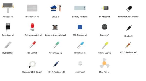 - RGB LED, buzzer, temperature sensor, photoresistor